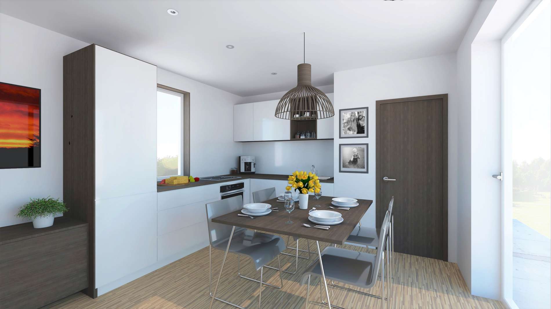 Vše potřebné k pohodlnému bydlení je soustředěno na minimální ploše. Obytný prostor propojený s jídelnou a kuchyňským koutem je prosvětlen velkým francouzským oknem.