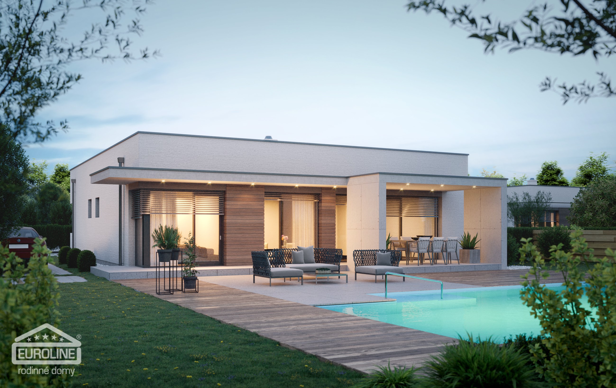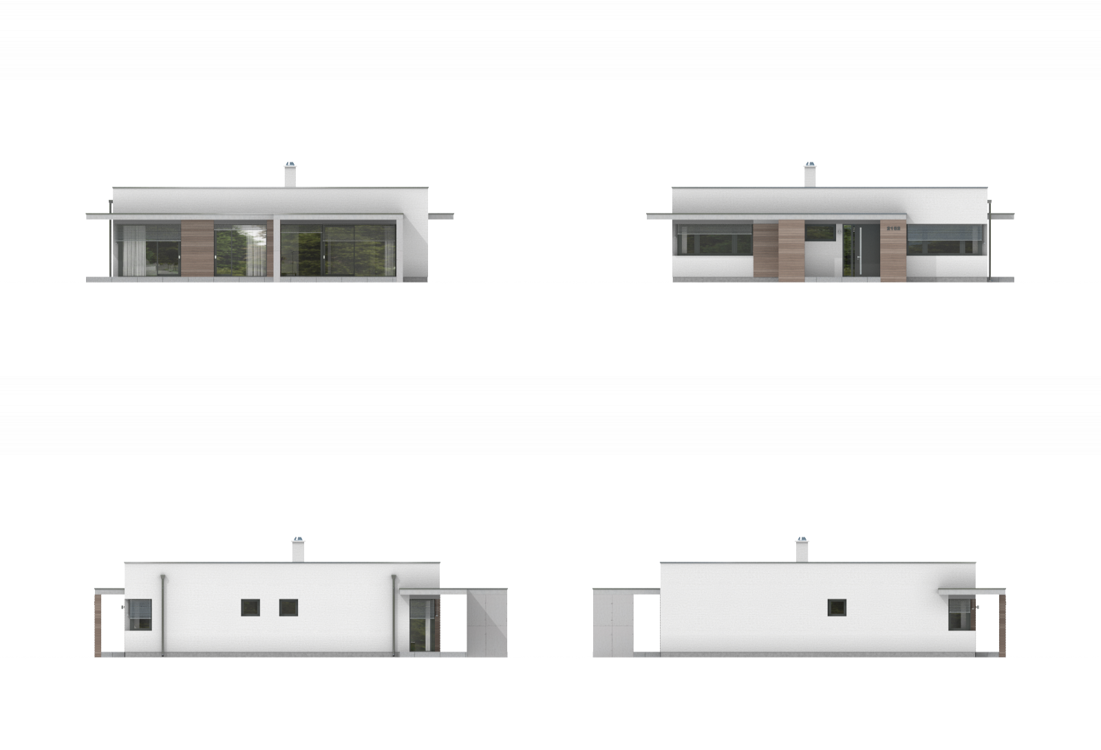 Moderní přízemní rodinný dům s plochou střechou a jednoduchými liniemi. Charakteristickým architektonickým prvkem tohoto bungalovu je překrytí terasy a vstupu. Dům je ideální pro bydlení rodiny se 2 dětmi.