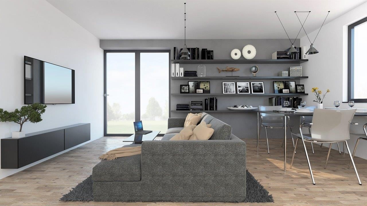 Srdcem domu je velkorysý obytný prostor propojený s jídelnou a kuchyňským koutem. Dostatek denního světla v interiéru a přirozené propojení s terasou zajišťuje velké francouzské okno.