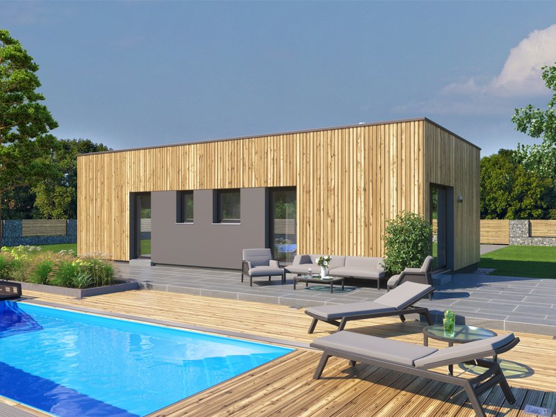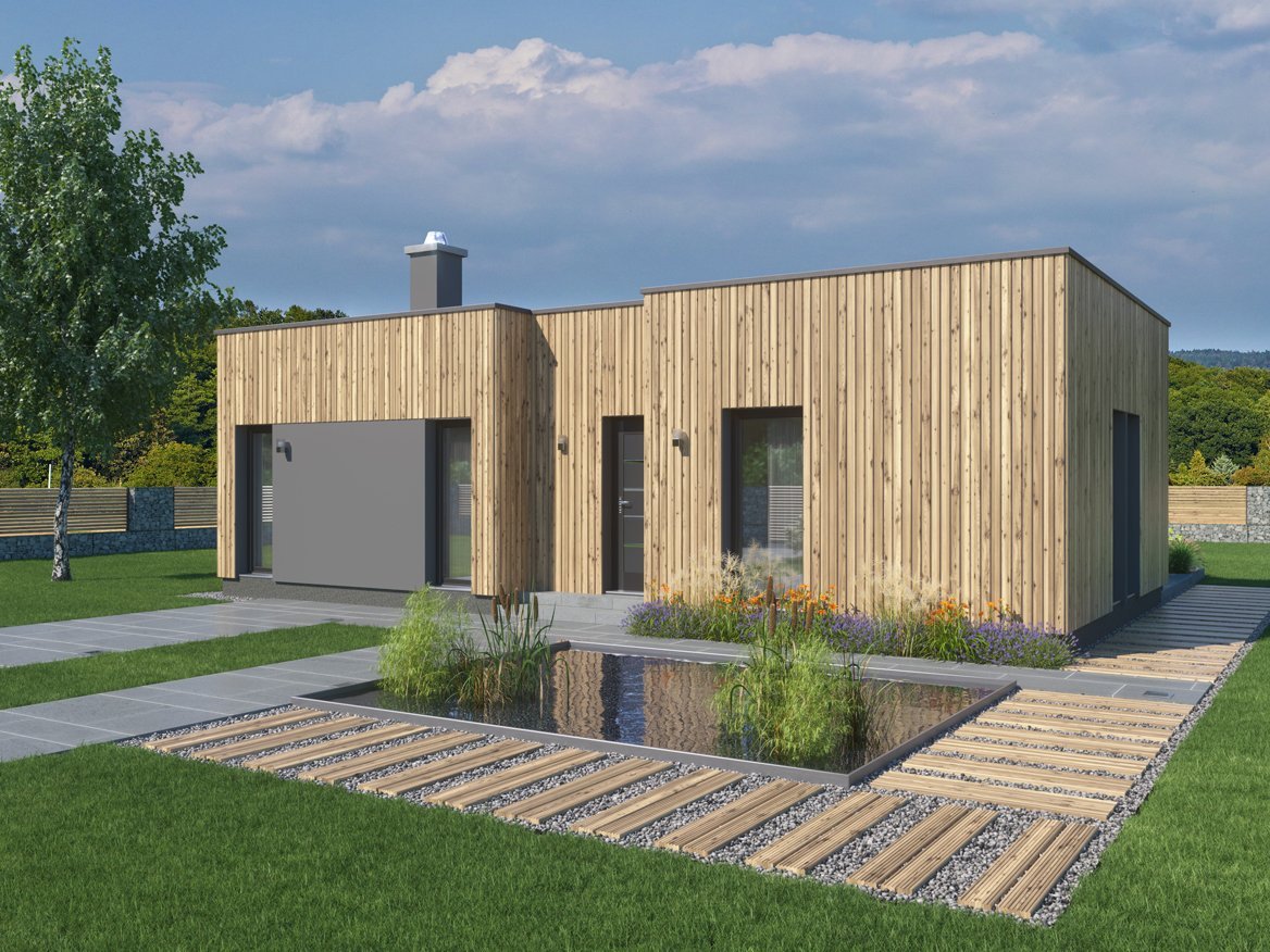 Moderní, jednoduchý bungalov s plochou střechou a čistými, elegantními liniemi. Použití dřevěného obkladu na fasádě dodává domu atraktivní vzhled s odkazem na soulad s přírodou.