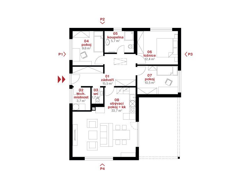 V pokojích i zádveří je navrženo dostatek prostoru pro instalaci vestavěných skříní.