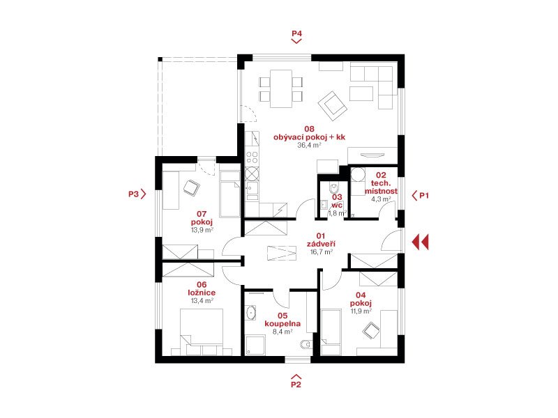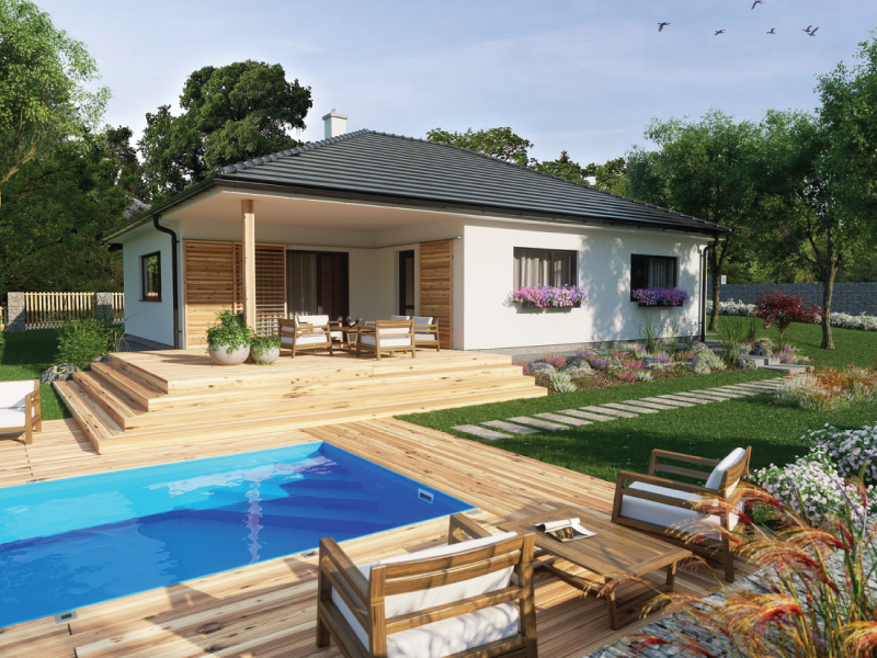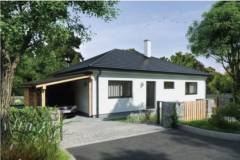 Klasický, 4pokojový rodinný dům typu bungalov, který svými vnitřními prostory uspokojí nároky na bydlení 4členné rodiny. Praktickým prvkem je terasa krytá přesahem střechy.