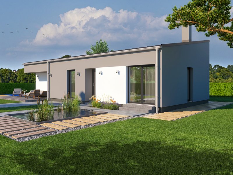 Moderní, kompaktní, 4pokojový bungalov s pultovou střechou. Dům je ideální pro pohodlné bydlení 4členné rodiny. Zajímavým architektonickým prvkem je zapuštění terasy a vstupu do hmoty domu.