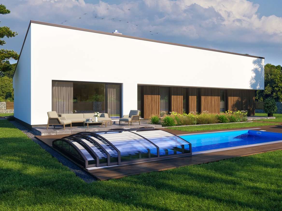 Moderní, praktický, 5pokojový rodinný dům typu bungalov s pultovou střechou.