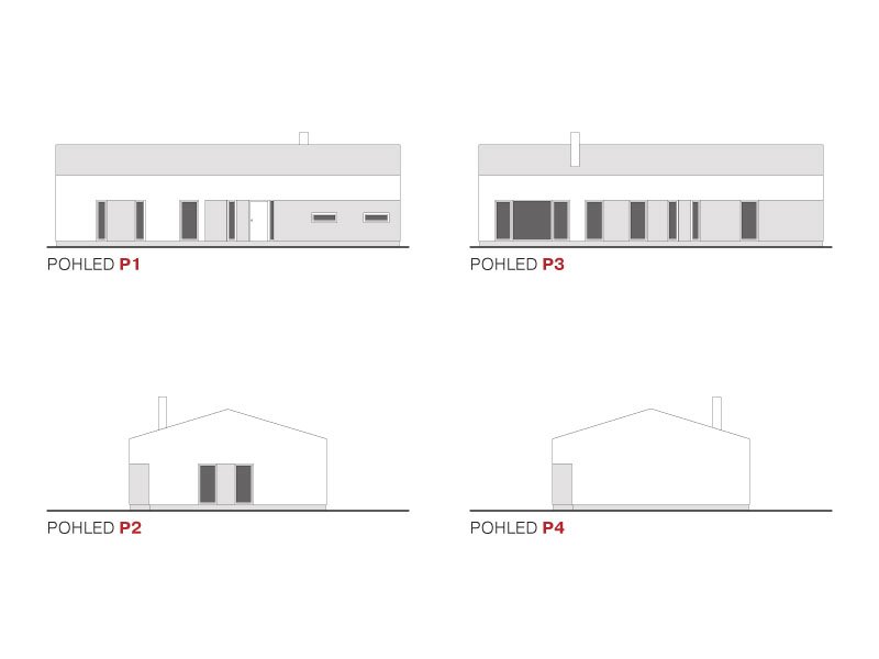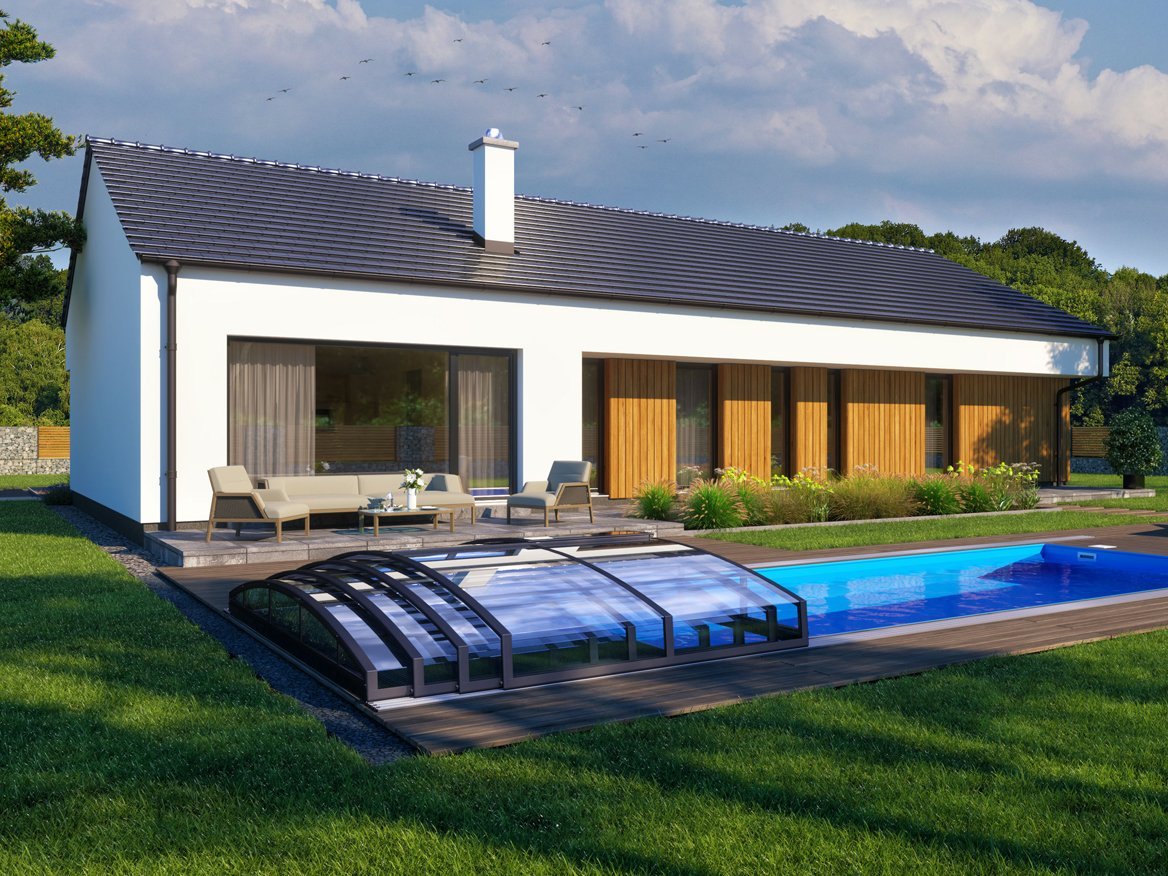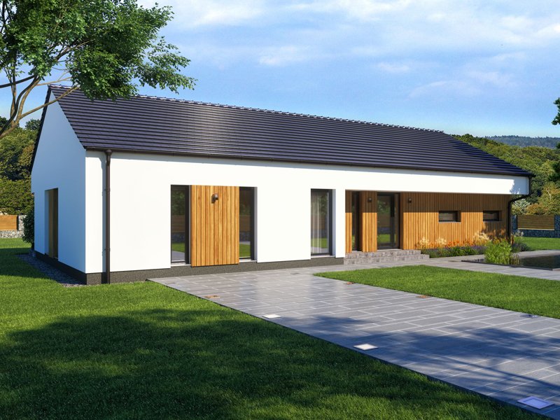 Moderní, kompaktní, 5pokojový bungalov se sedlovou střechou. Dřevěný obklad na části fasády dodává domu atraktivní vzhled.