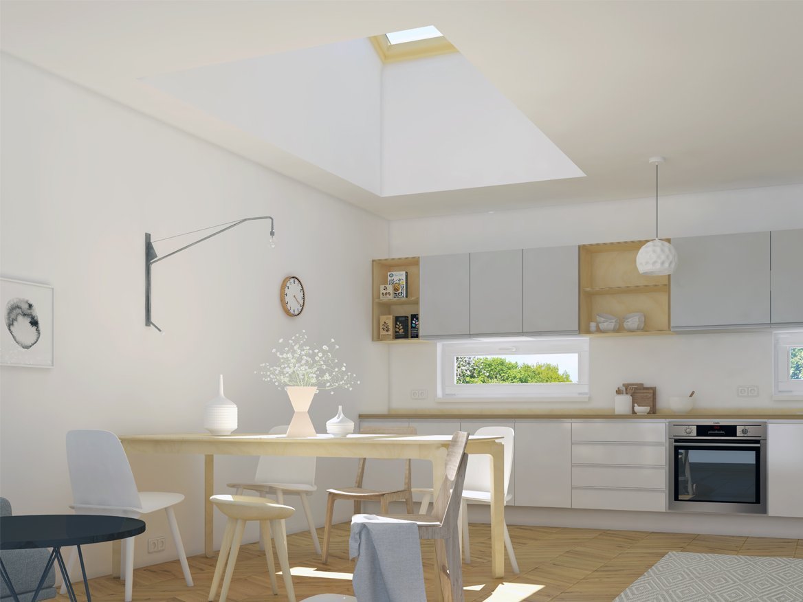 Velkorysý obytný prostor je propojený s jídelnou a kuchyňským koutem. Dostatek denního světla v interiéru zajišťuje prosklená stěna a také střešní světelná šachta.