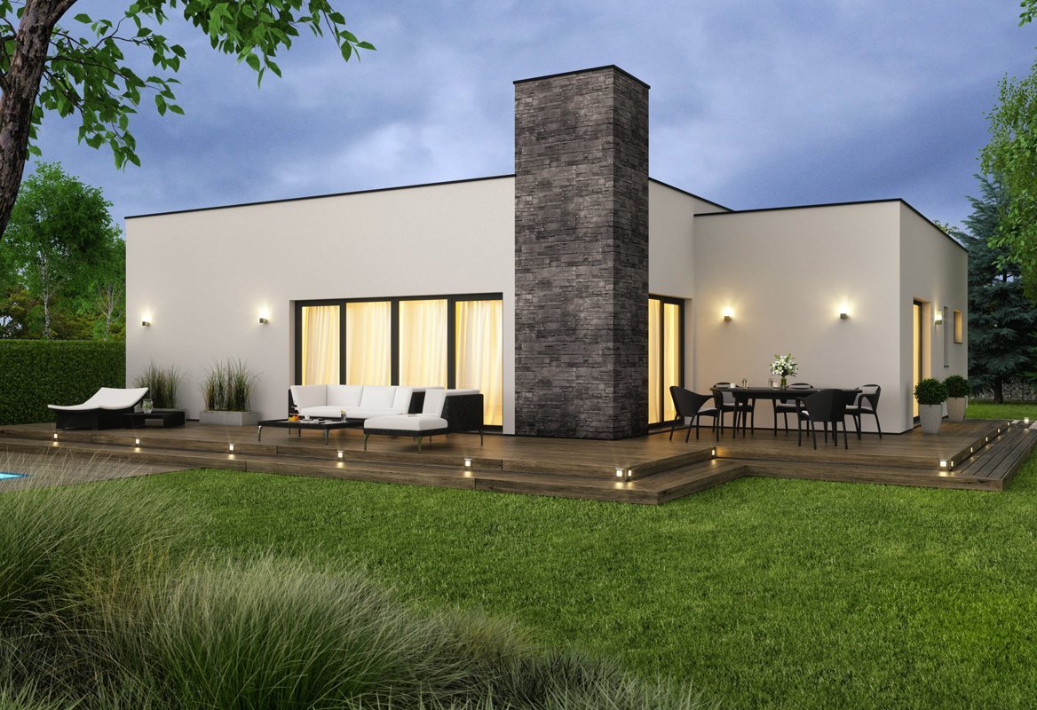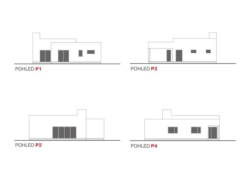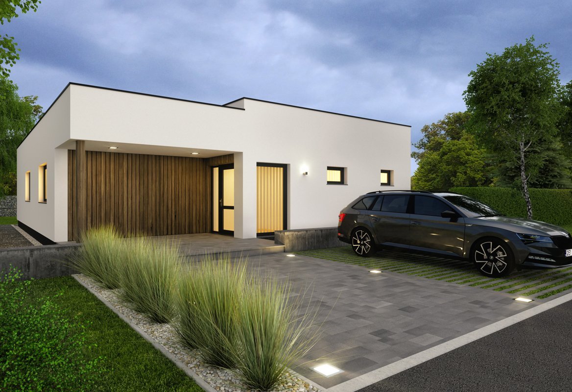 Originální, moderní rodinný dům typu bungalov s plochou střechou. Zajímavým architektonickým prvkem je vstup překrytý přesahem hmoty domu.