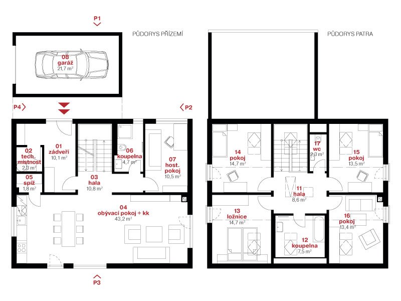 V podkroví jsou navrženy 4 pohodlné ložnice s prostorem pro vestavěné skříně, dále koupelna s vanou a samostatná toaleta.