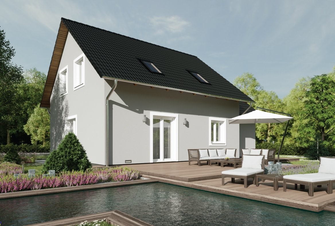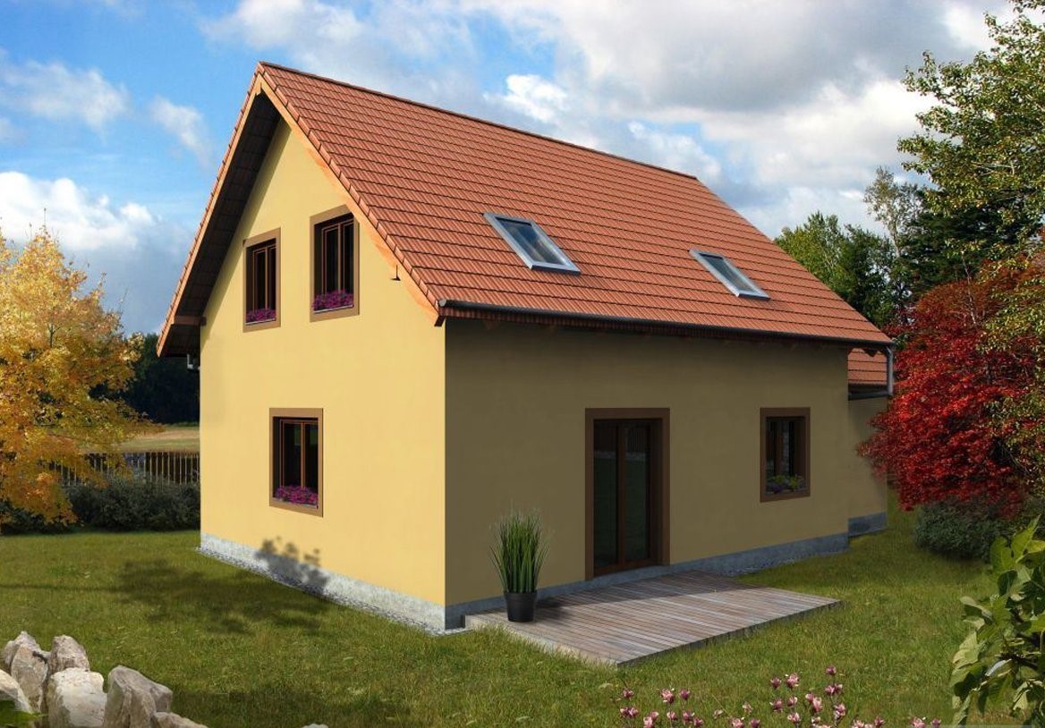 Kompaktní, rodinný dům klasického vzhledu se sedlovou střechou a obytným podkrovím.