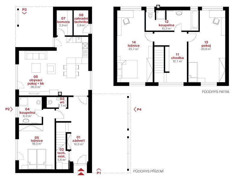 V patře jsou navrženy 2 nadstandardně velké pokoje a koupelna s vanou i sprchovým koutem.