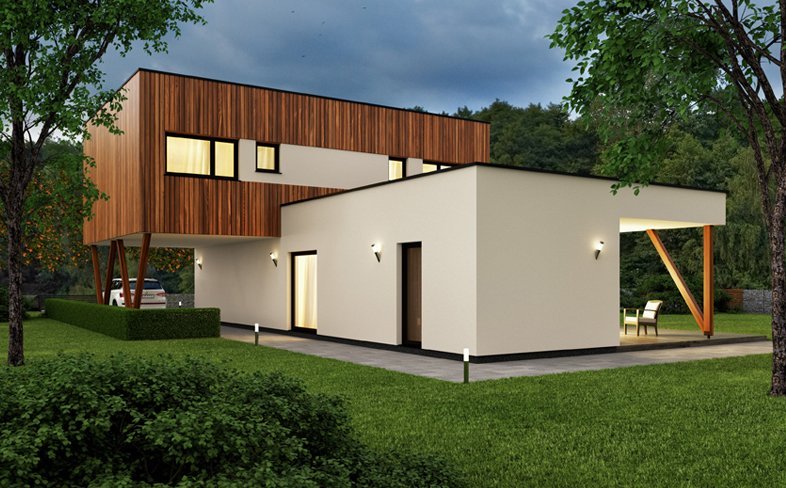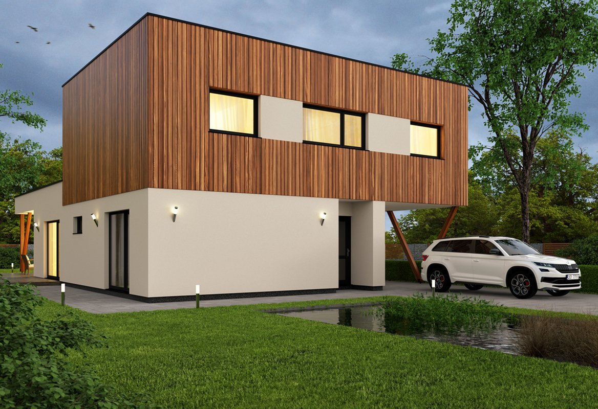 Moderní, patrový rodinný dům s plochou střechou a elegantními liniemi. Dům je tvořen 2 kvádry, které jsou opticky odlišeny provedením fasády. Zajímavým architektonickým prvkem je kryté parkovací stání vzniklé přesahem hmoty horního podlaží.