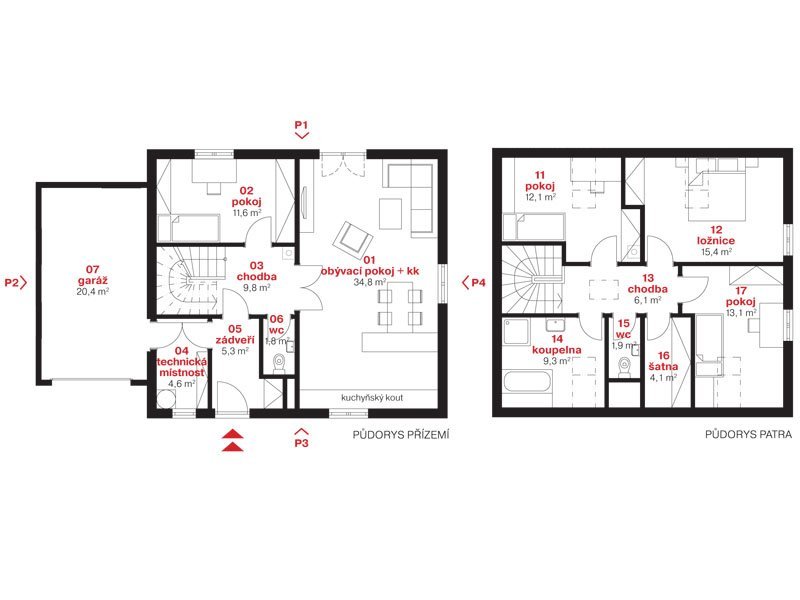 V patře jsou umístěny 2 dětské pokoje, ložnice rodičů, samostatná šatna a velkorysá koupelna s vanou a sprchovým koutem.