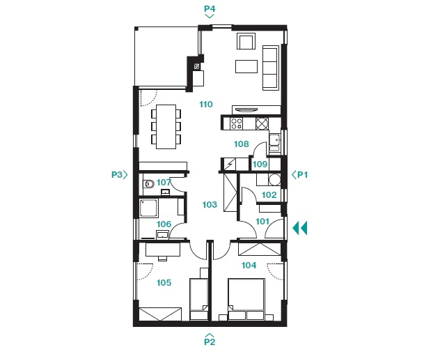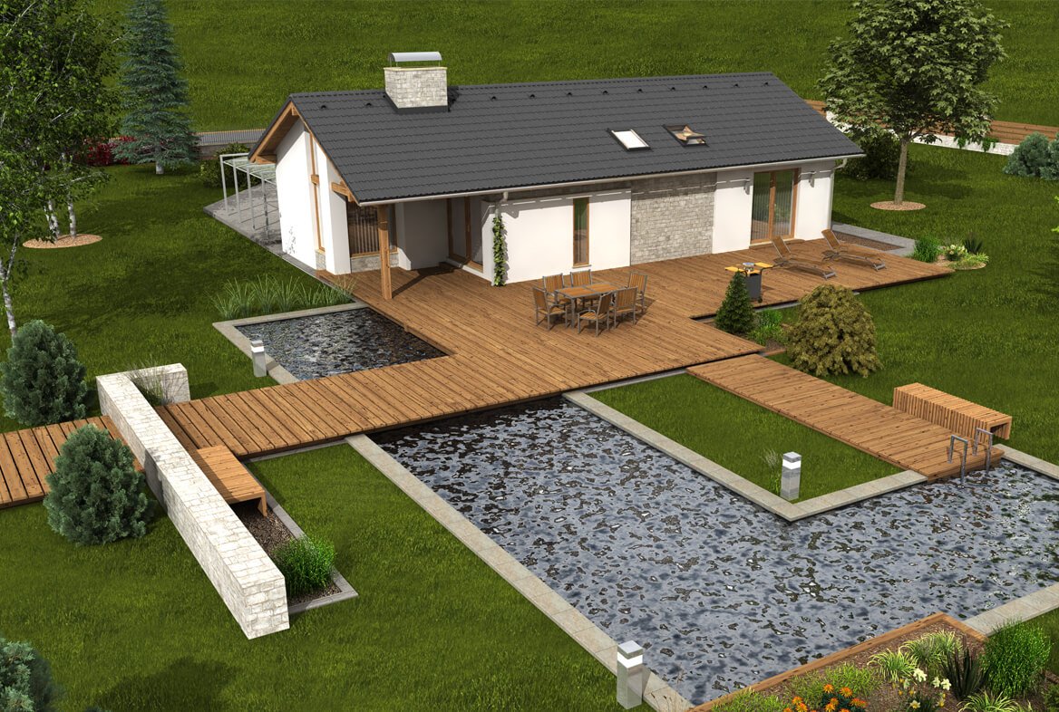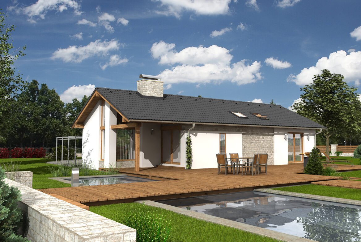 Jednoduchý, kompaktní, 3pokojový bungalov se sedlovou střechou. Zajímavým a praktickým prvkem je terasa překrytá přesahem střechy.