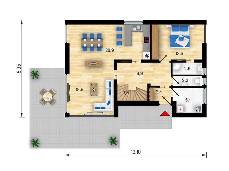 V přízemí domu je navržen obývací prostor, propojený s jídelnou a kuchyňským koutem. Velká francouzská okna interiér přirozeně propojují s přilehlou terasou a zajišťují jeho dokonalé prosvětlení.