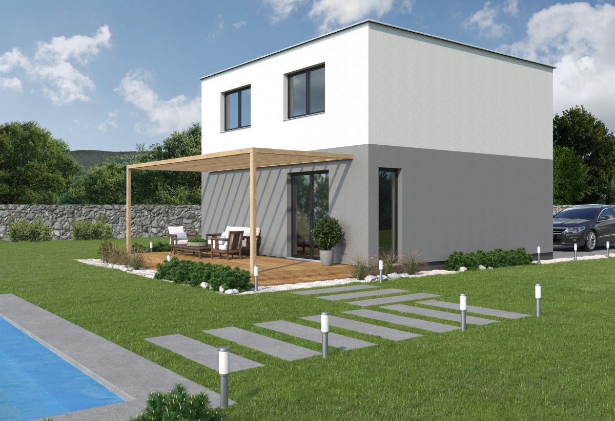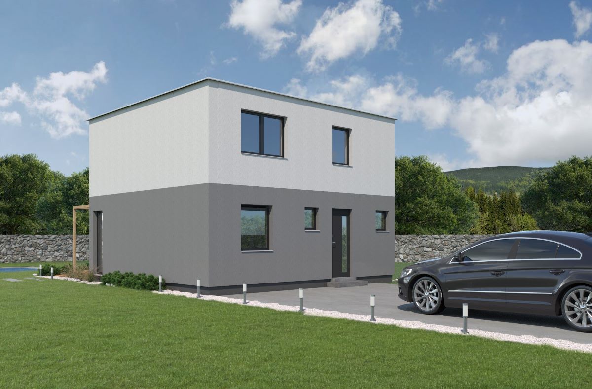 Moderní, 4pokojový, patrový dům s jednoduchými liniemi a plochou střechou.