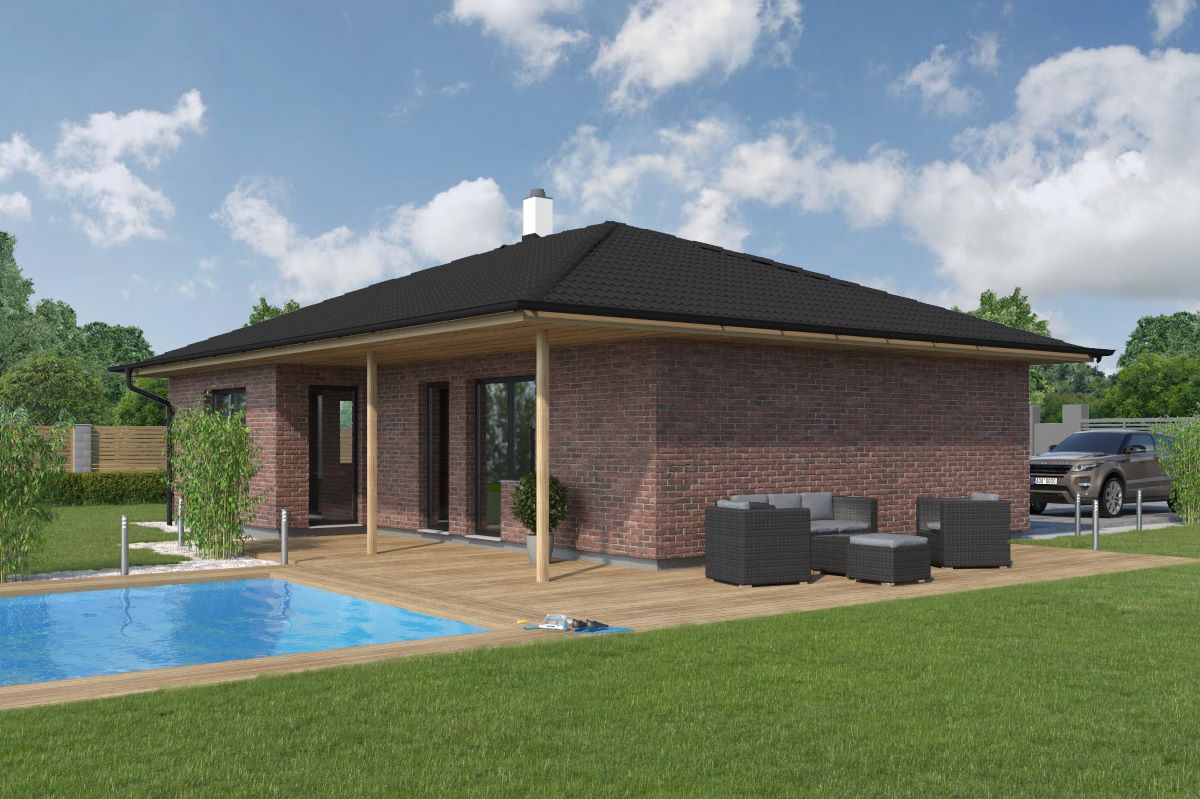 Jednoduchý, kompaktní, 3pokojový bungalov s krytou terasou. Půdorys domu ve tvaru L umožňuje výstup na terasu ze všech obytných místností.