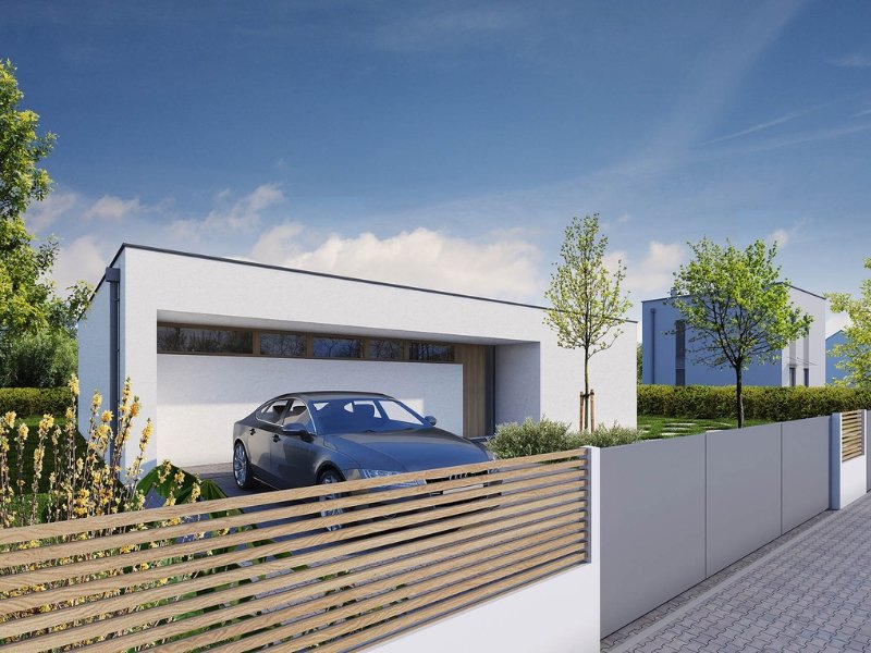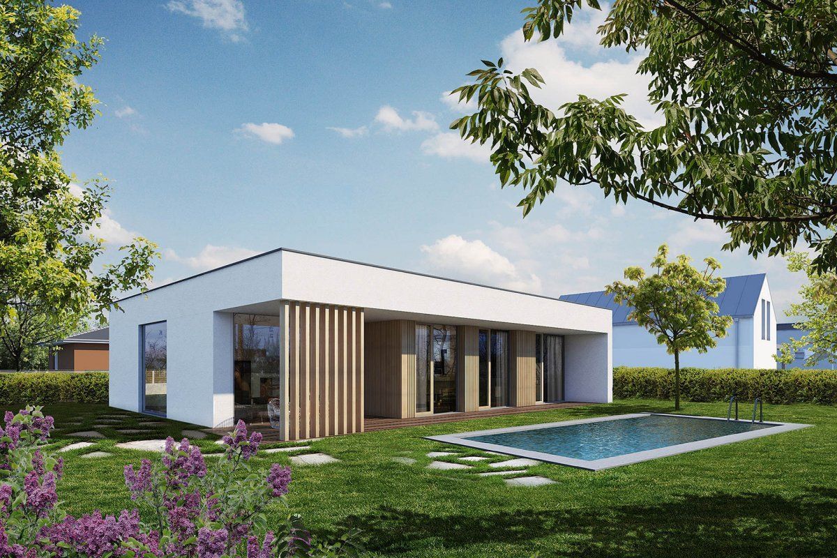 Jednoduchý, moderní bungalov s plochou střechou a krytou terasou. Praktickým architektonickým prvkem je uskočená hmota domu, díky čemuž vzniká závětří na jedné straně a krytá terasa na straně druhé. Na terasu je možné vystoupit ze všech obytných místností.