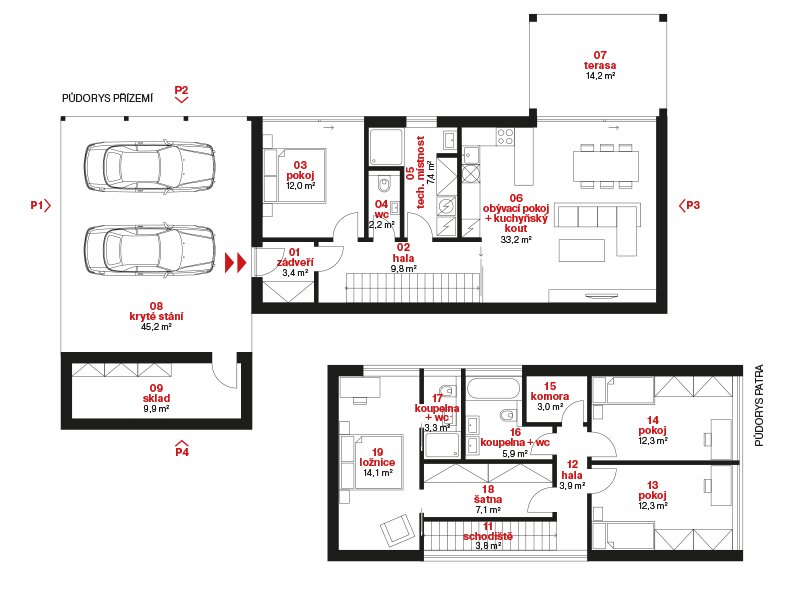 V patře je navržena privátní část domu, kterou tvoří velkorysá ložnice rodičů s vlastní koupelnou, dále 2 dětské pokoje a další prostorná koupelna s vanou.