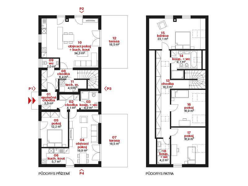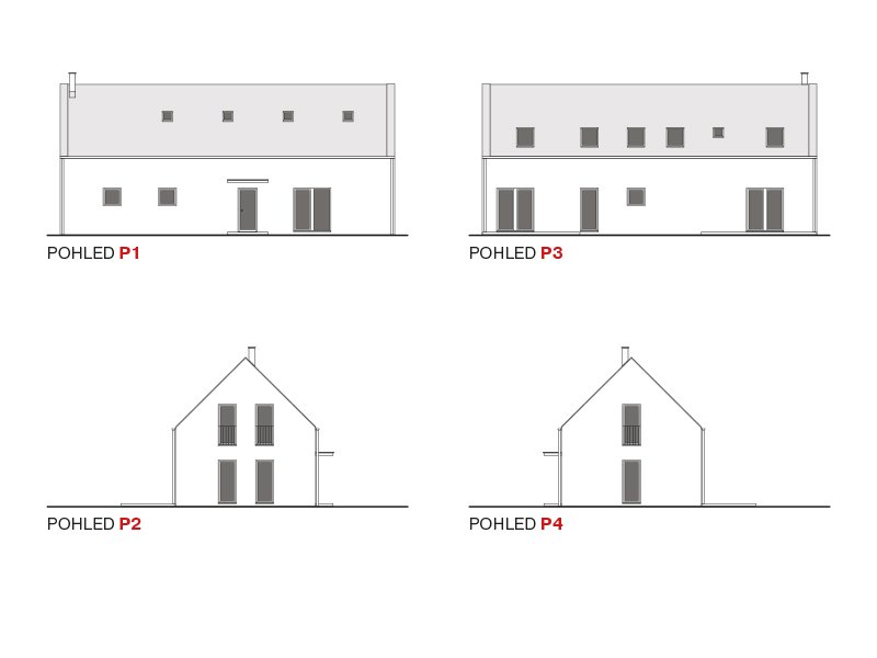Byt 4kk zaujímá část přízemí domu a celé patro. V přízemí je obývací prostor propojený s jídelnou a kuchyňským koutem. Velká francouzská okna interiér přirozeně propojují s terasou a zajišťují jeho dokonalé prosvětlení. Je zde navržen také krb.