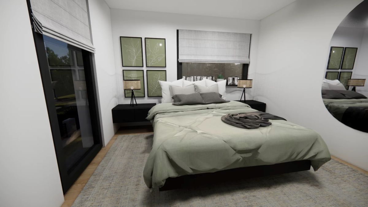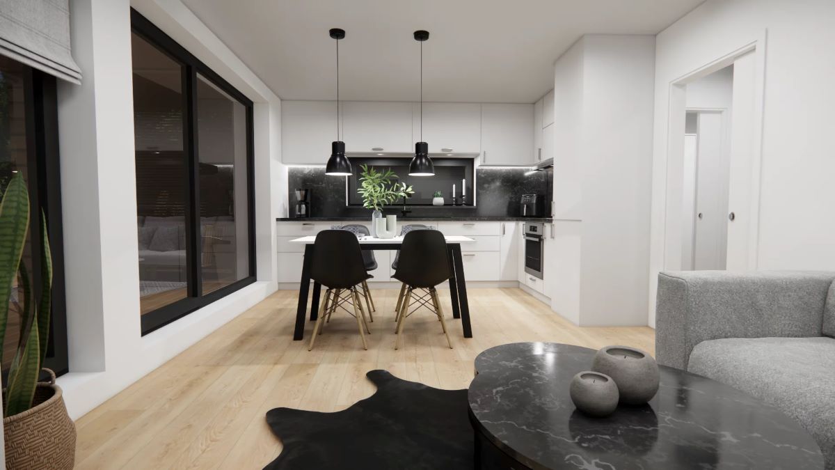 Byt v přízemí je tvořen obývacím pokojem s kuchňským koutem, ložnicí a dalším pokojem, který může sloužit jako pracovna, pokoj pro hosty, dětský pokoj nebo hobby místnost.