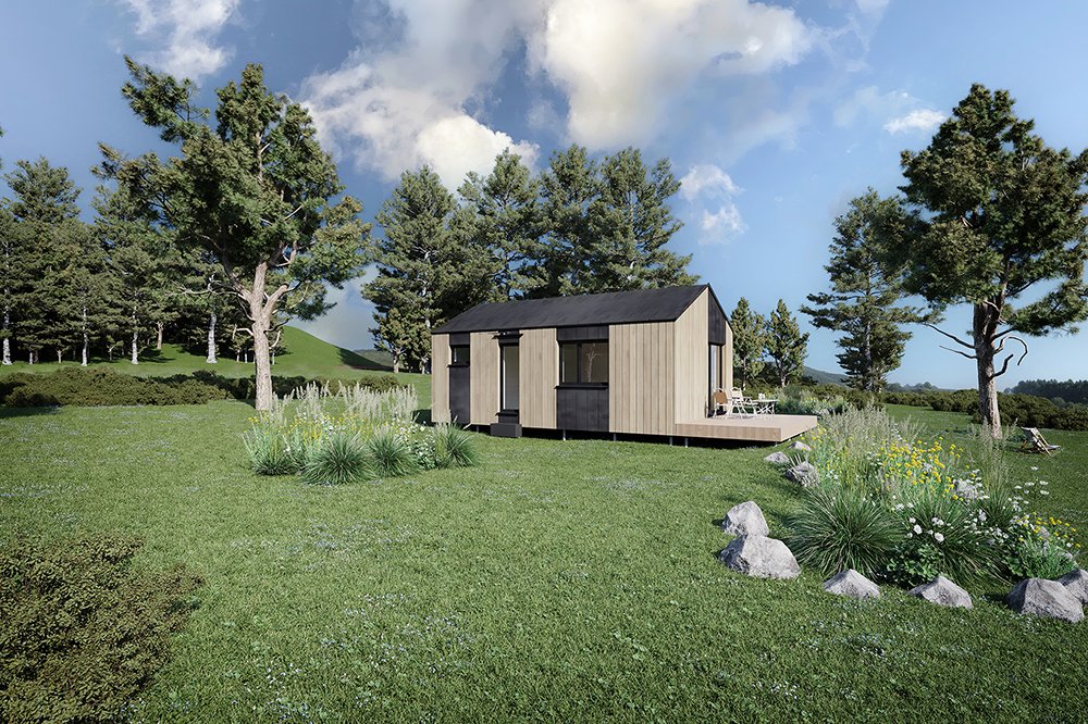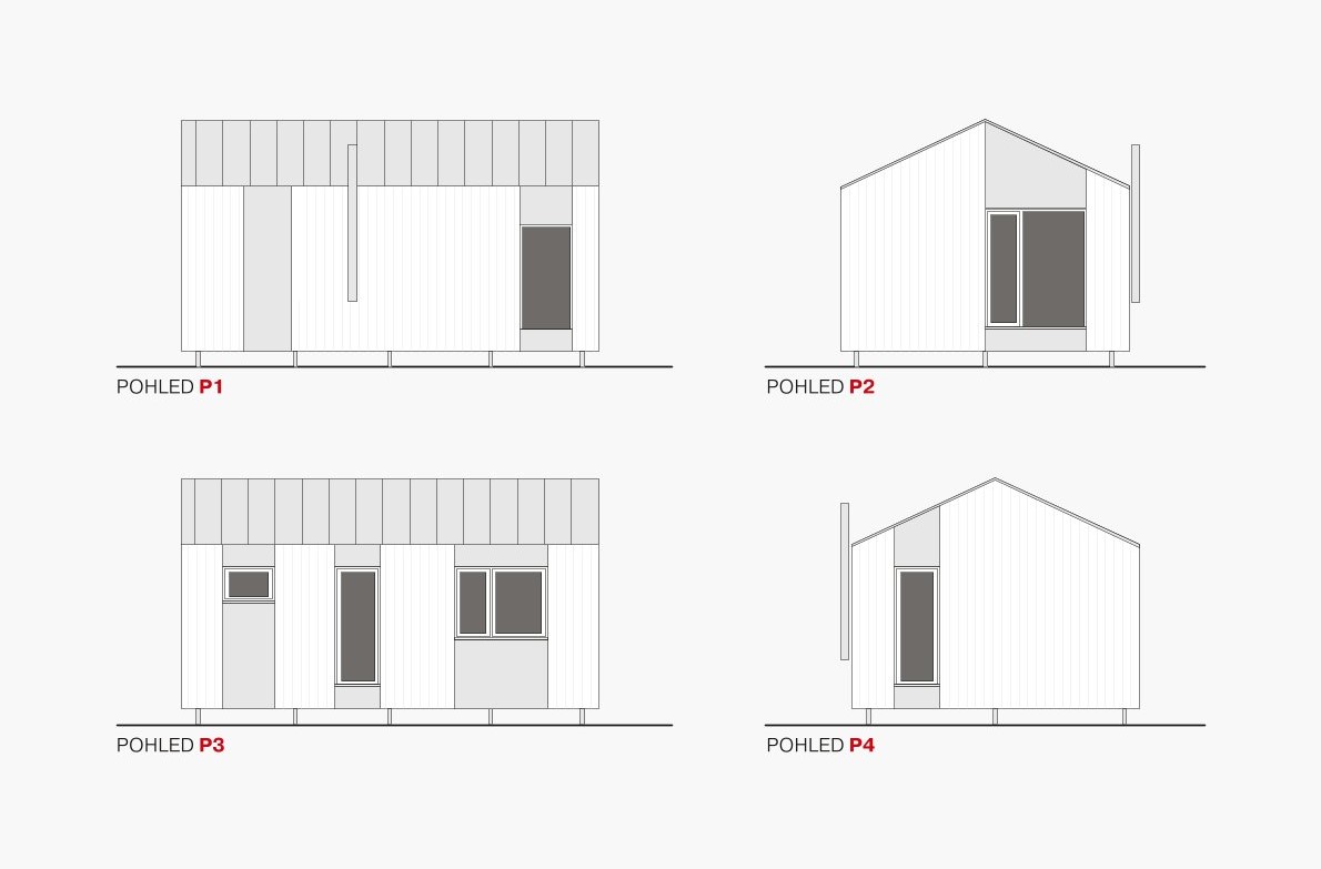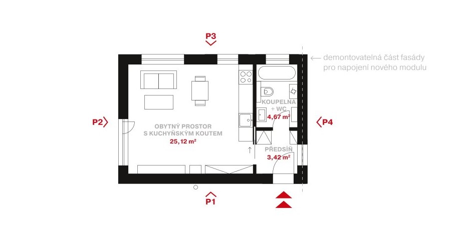Modulový rostoucí dům. Základní modul kategorie 1kk, který může být v budoucnu jednoduše rozšířen o další moduly - např. o ložnici, dětský pokoj, ale také terasu nebo garáž.