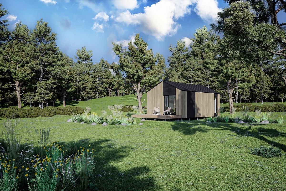 Modulový rostoucí dům. Základní modul kategorie 1kk může být v budoucnu jednoduše rozšířen o další moduly - např. o ložnici, dětský pokoj, ale také terasu nebo garáž. Dům tak roste společně s vašimi potřebami.