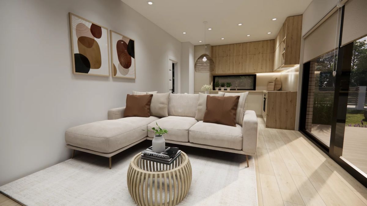 Obývací prostor je dokonale prosvětlen velkými francouzskými okny, která zároveň interiér přirozeně propojují s terasou a zahradou.