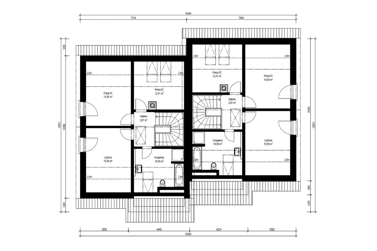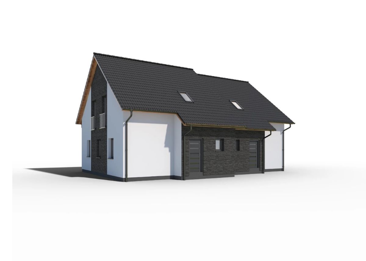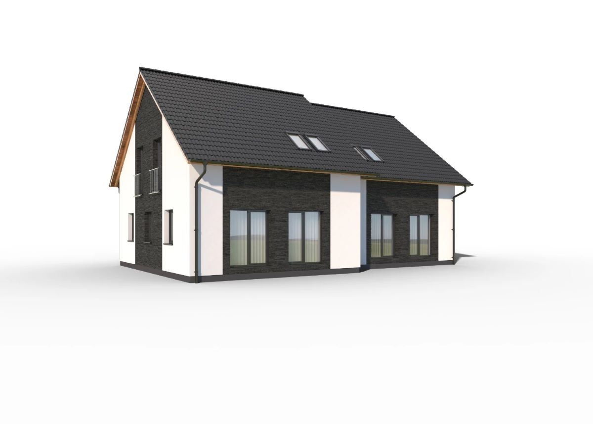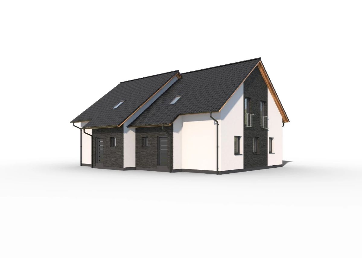 Prostorný dvojdům klasického vzhledu se sedlovou střechou. Oba domy jsou identické, zrcadlově otočené, každý s dispozicí 5kk.