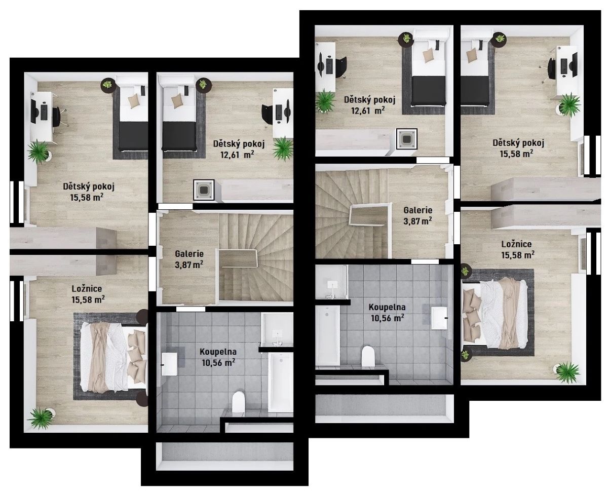 V obytném podkroví jsou umístěny 3 velkorysé ložnice a nadstandardně velká koupelna s vanou.