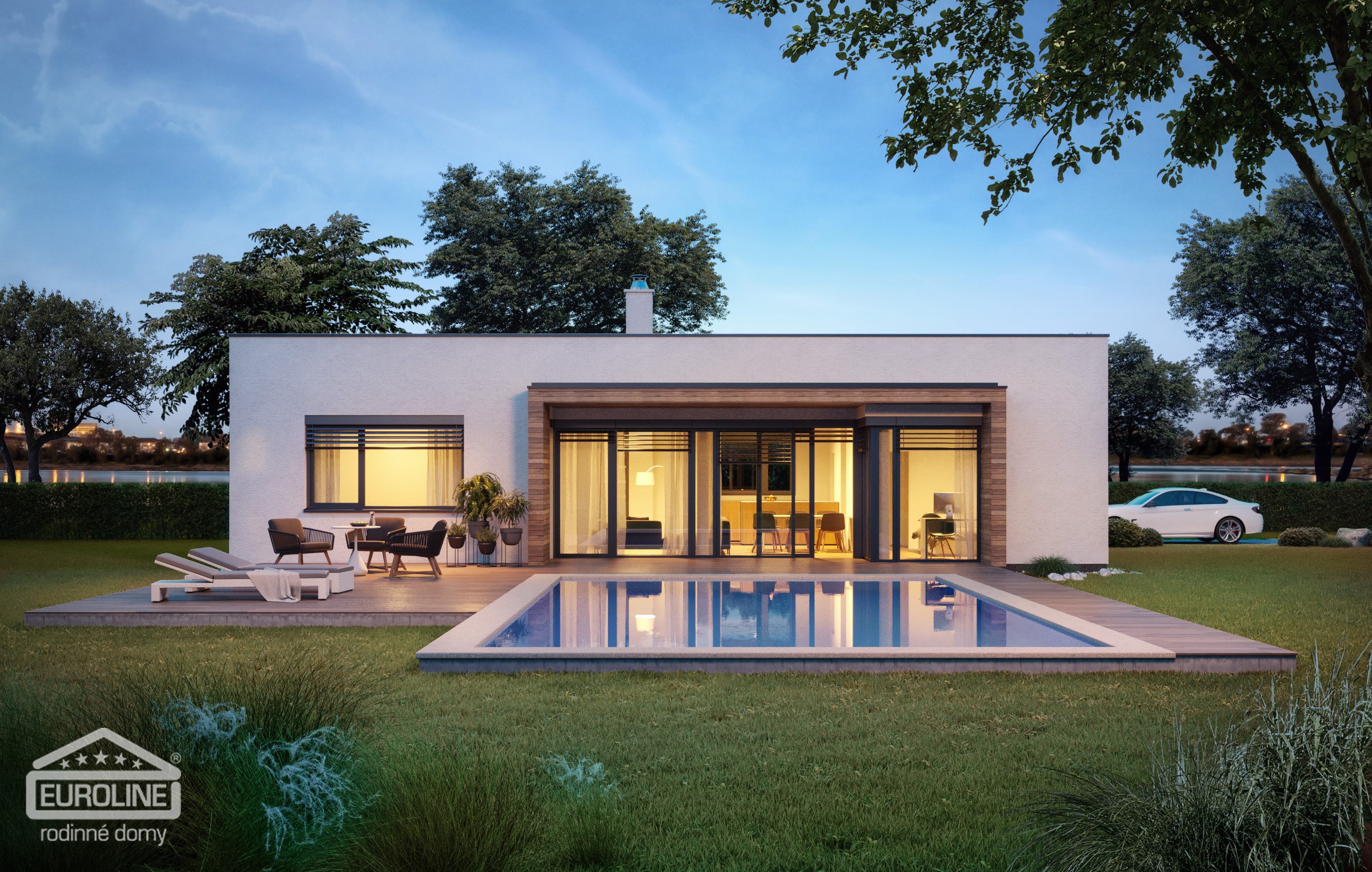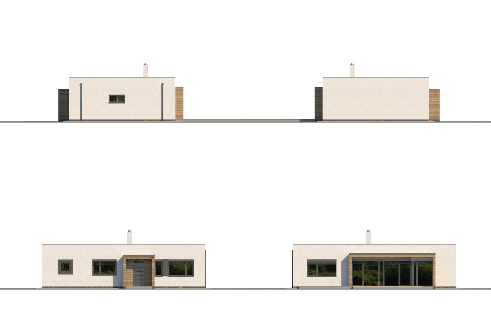 Moderní přízemní rodinný dům s jednoduchými liniemi a plochou střechou určený pro pohodlné bydlení 4členné domácnosti.