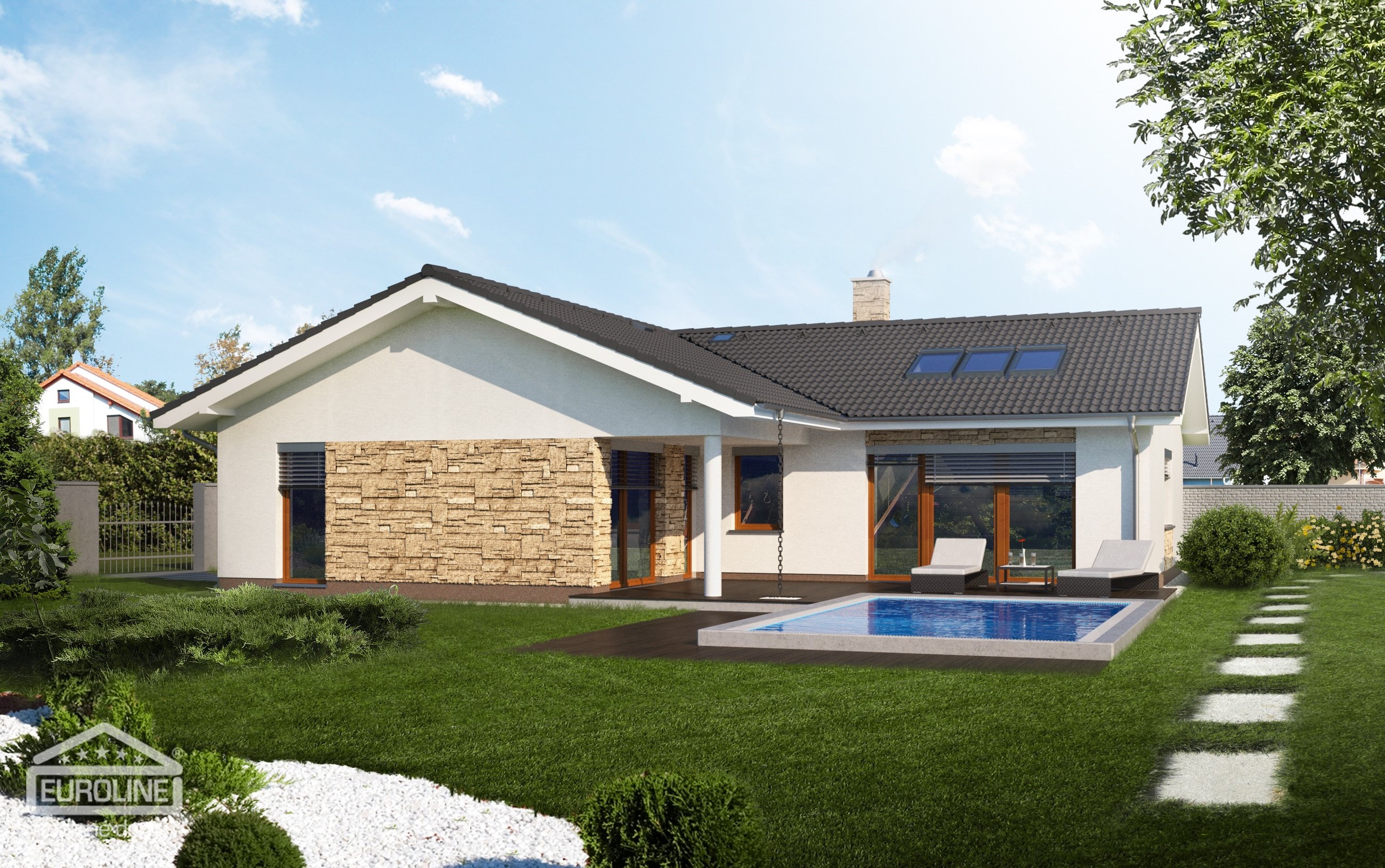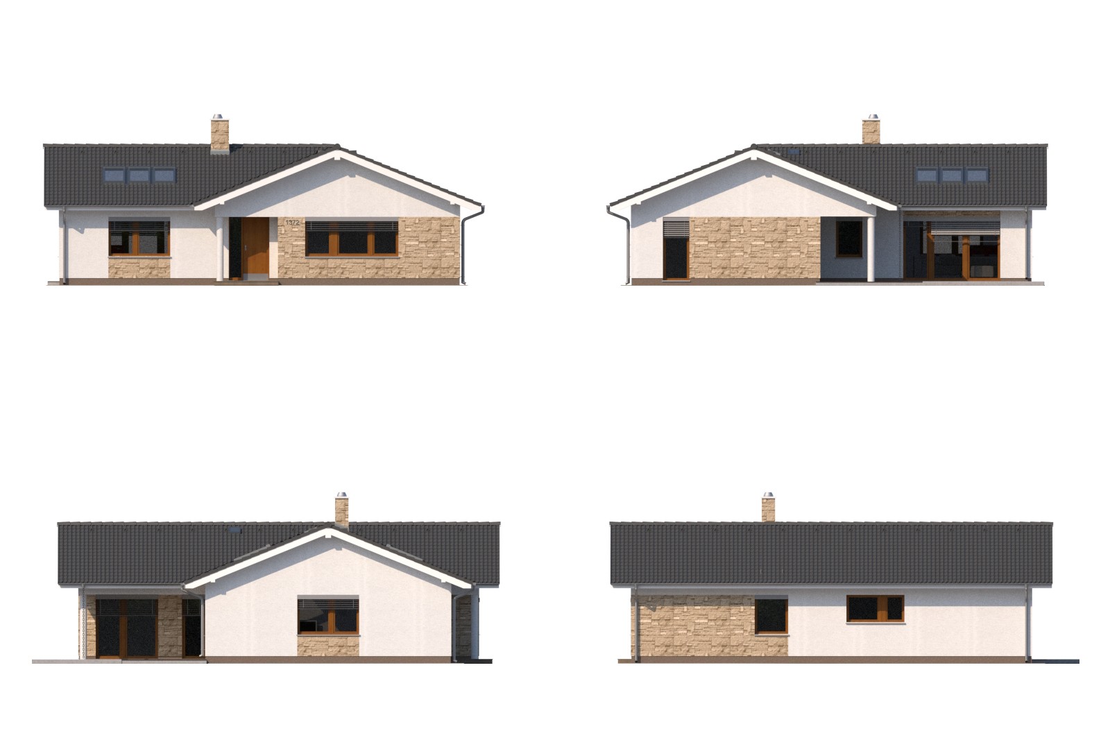 Středně velký rodinný dům typu bungalov na půdorysu ve tvaru L je vhodný pro větší domácnost se 2 - 3 dětmi. Výhdou domu je ekonomické konstrukční řešení bez pevné stropní konstrukce se sádrokartonovým podhledem. Zajímavým a zároveň praktickým prvkem je překrytí vstupu i části terasy.