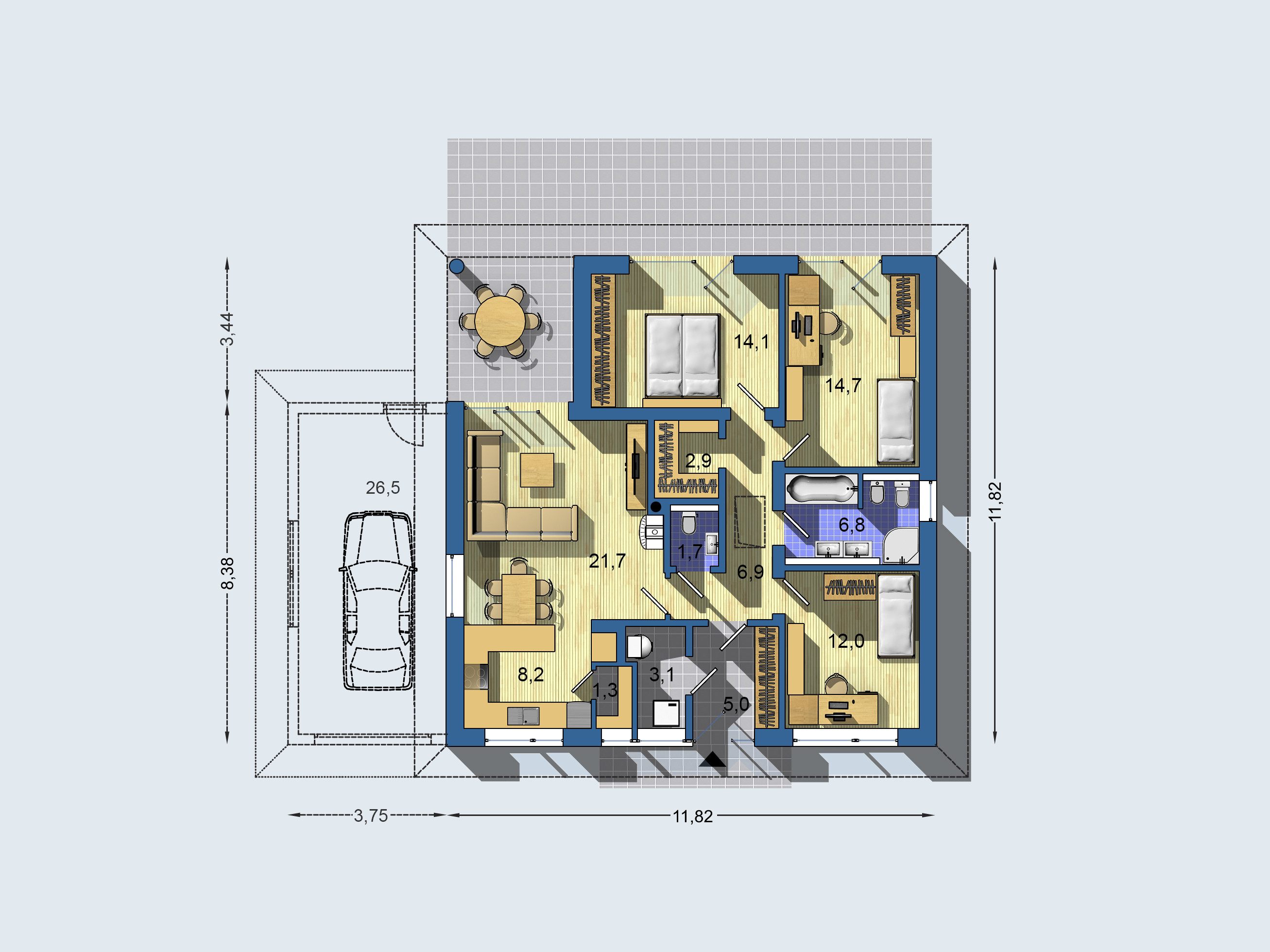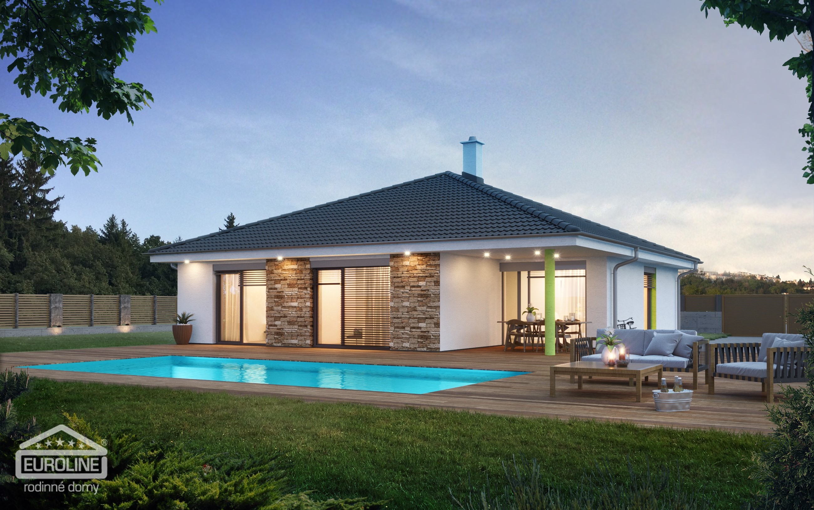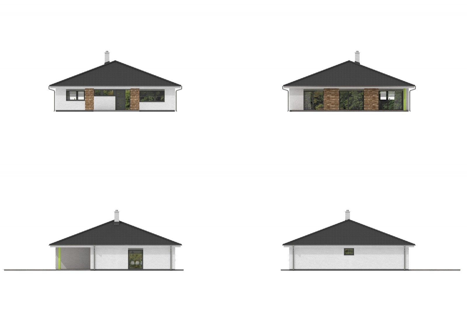 Jednoduchý a kompaktní rodinný dům typu bungalov s částečně překrytou terasou, splňující nároky na pohodlné bydlení 4členné rodiny. Efektivně využitý půdorys s minimální plochou chodeb.