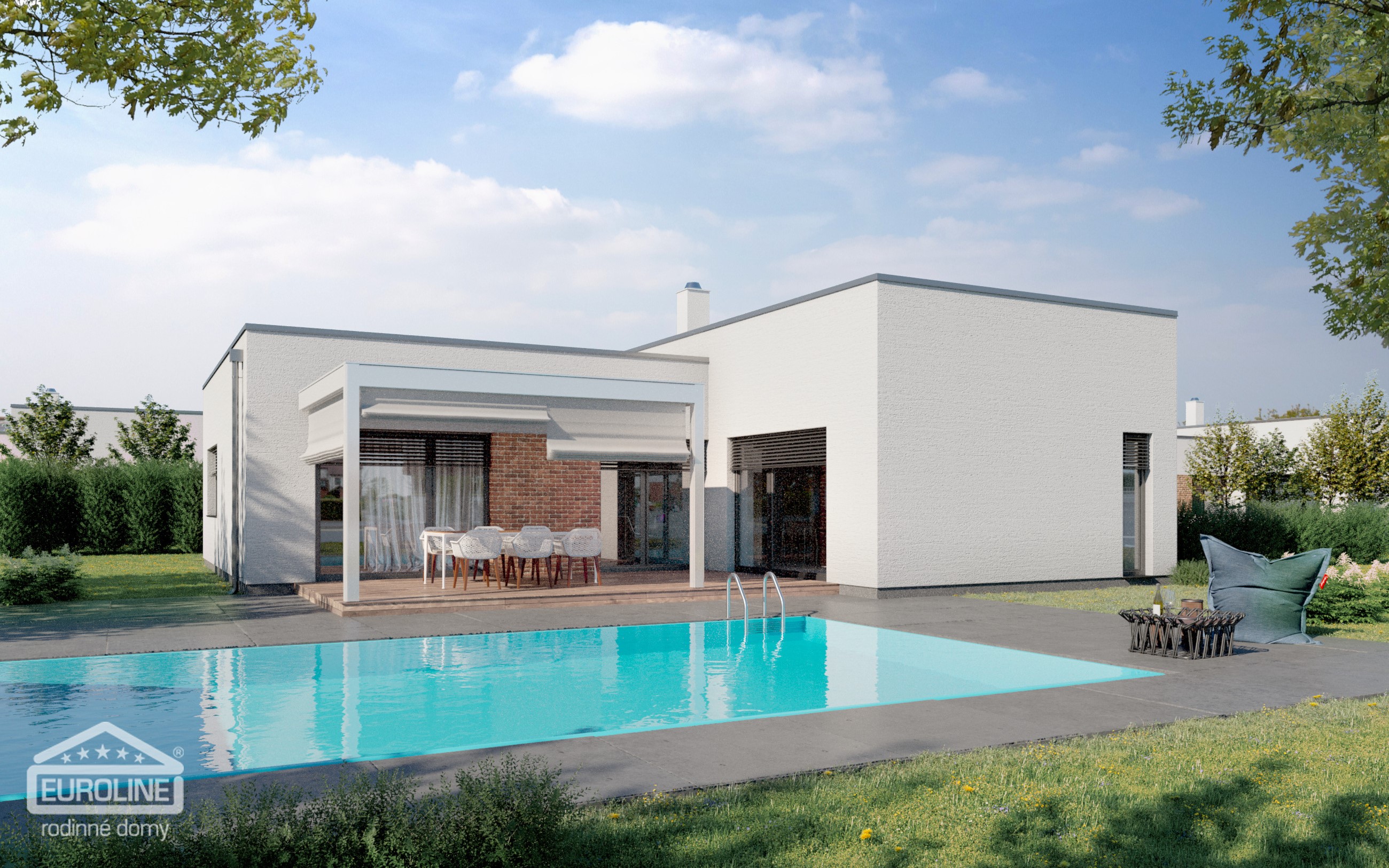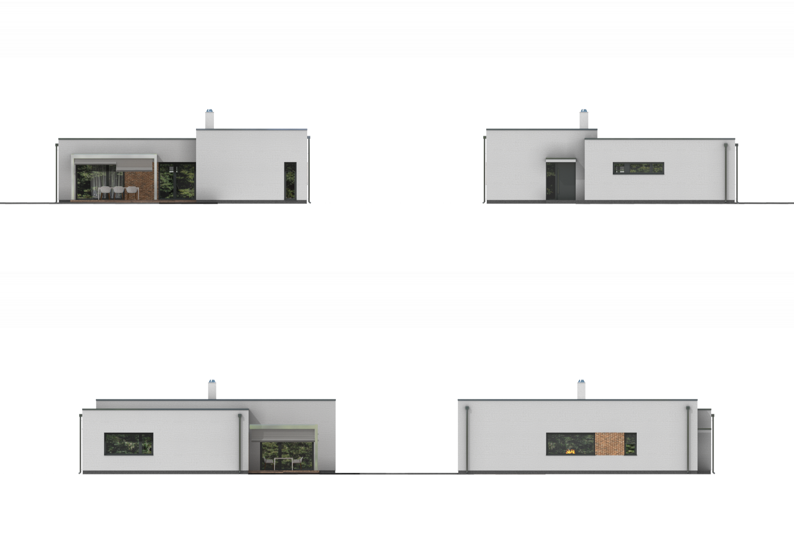 Moderní přízemní rodinný dům s plochou střechou určený pro 4člennou domácnost. Společenská část domu má zvýšený strop, což navozuje pocit vzdušnosti.