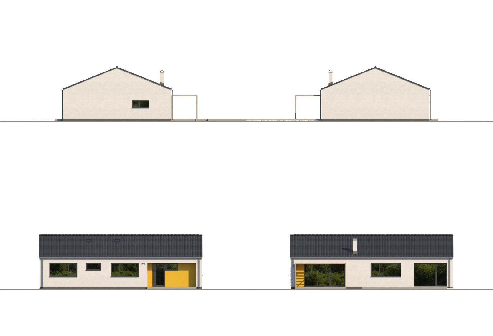 Moderní, kompaktní rodinný dům typu bungalov se sedlovou střechou. Dům je klasického vzhledu a zajímavým a zároveň praktickým prvkem je překrytí vstupu a části terasy přesahem střechy. Dům je ideální pro pohodlné bydlení rodiny se 2 dětmi. Výhodou je ekonomicky úsporné řešení bez pevného stropu se sádrokartonovým podhledem.