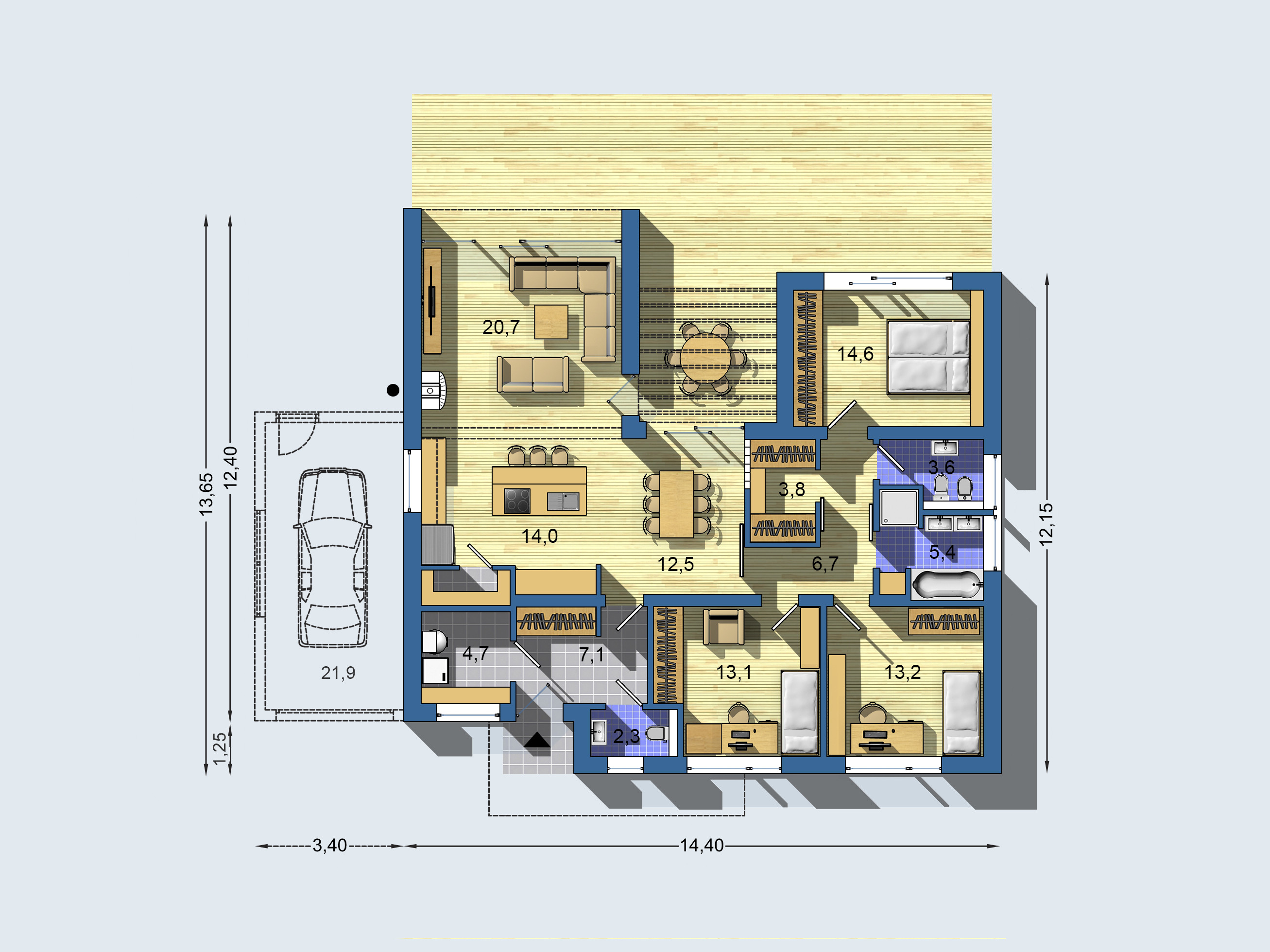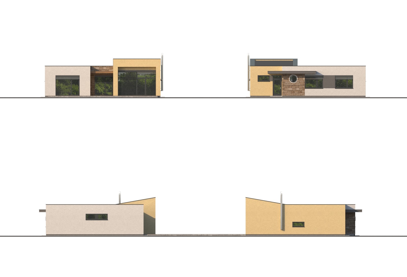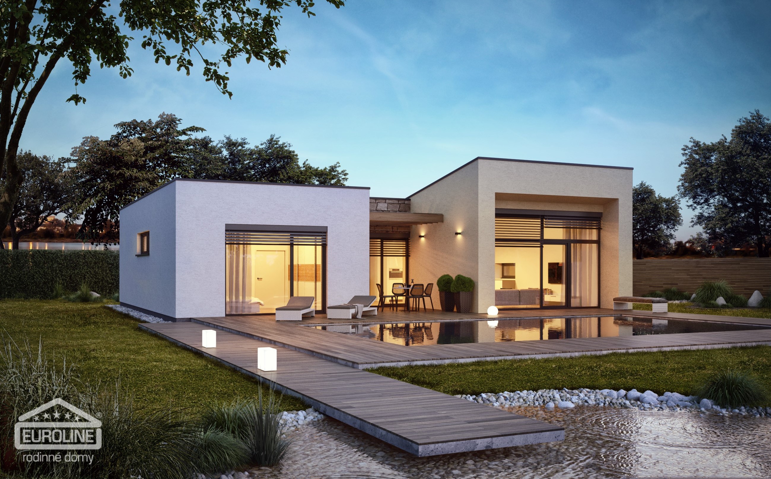Moderní přízemní rodinný dům s terasou ve formě chráněného atria, které je možné zastřešit pergolou. Dům je ideální pro pohodlné bydlení 4členné domácnosti.