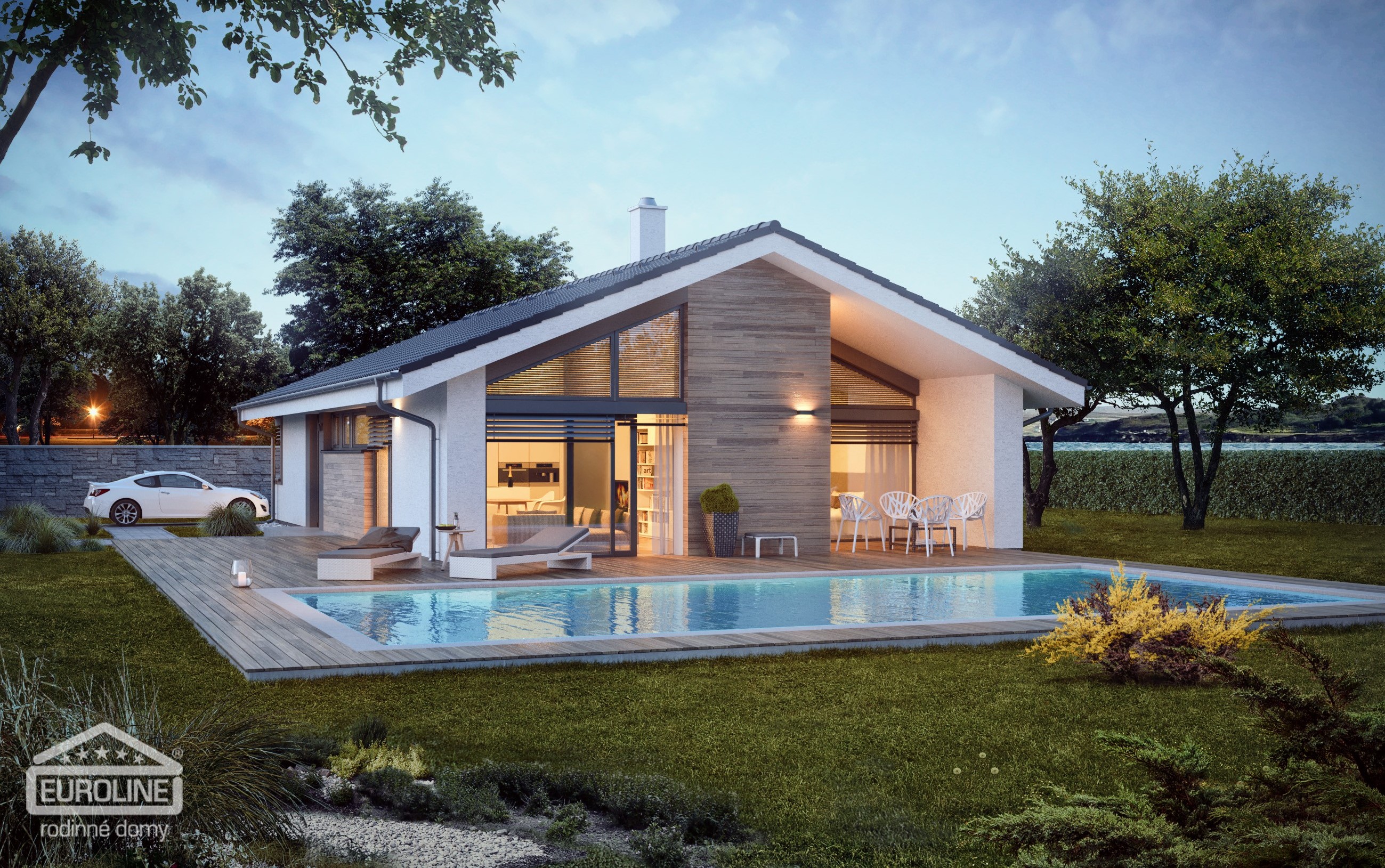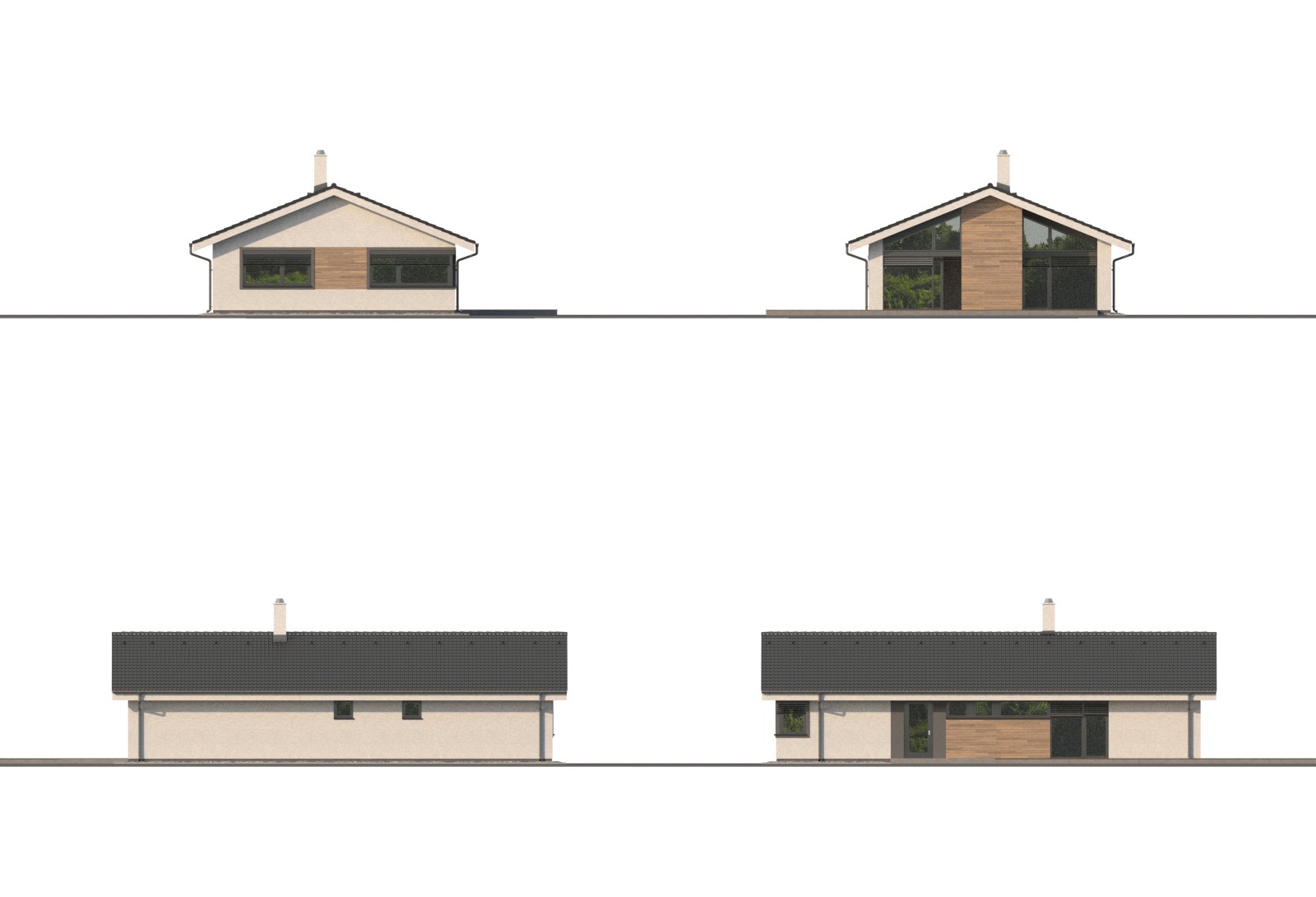 Jednoduchý moderní dům klasického tvaru se sedlovou střechou vhodný i na úzké parcely. Tento bungalov je jako stvořený pro rodinu se 2 dětmi. Zajímavými architektonickými prvky jsou velké prosklené plochy v obývacím prostoru a ložnici a překrytí části terasy přesahem střechy.