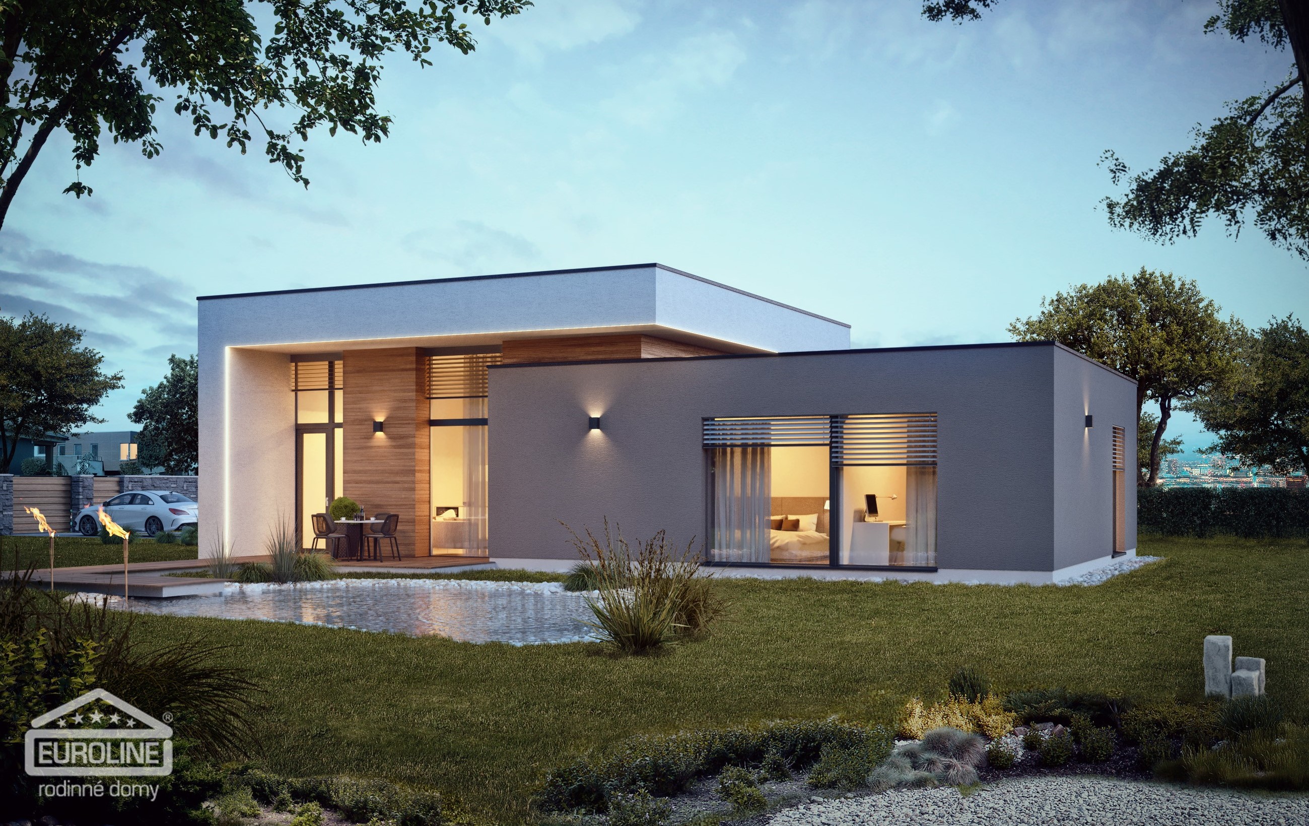 Prostorná vstupní hala rozděluje denní a noční část domu a bohatým prosklením je propojená s obývacím pokojem. Obytný prostor s kuchyní působí díky vysokým stropům velmi vzdušně a díky velkým proskleným plochám je přirozeně propojen s krytou terasou. Noční část domu je od té denní oddělena a je tvořena třemi prostornými pokoji a velkou koupelnou. Ložnice rodičů má vlastní šatnu.