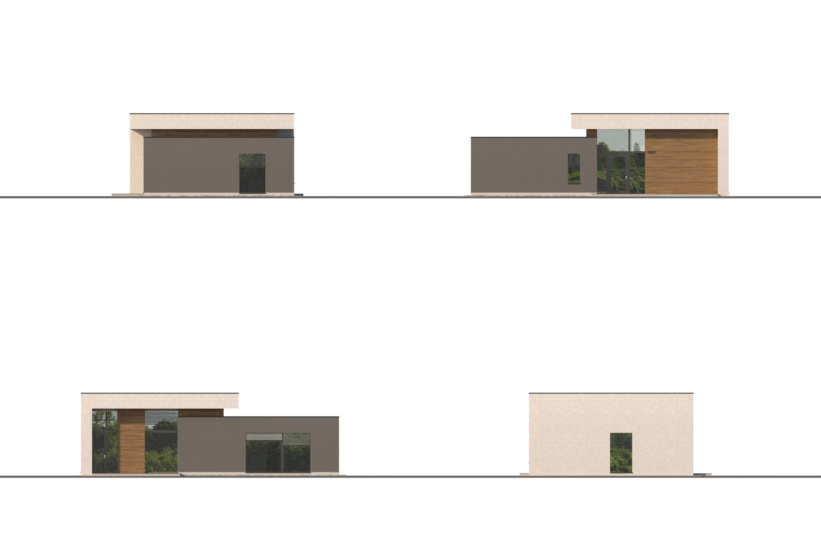 Moderní, jednopodlažní rodinný dům odrážející současné trendy v architektuře je vhodný pro pohodlný život 4členné rodiny. Hmotově je dům tvořen dvěma kvádry různých výšek a různého materiálového provedení, výrazným charakteristickým a zároveň praktickým prvkem je překrytí vstupu a části terasy přesahem střechy.