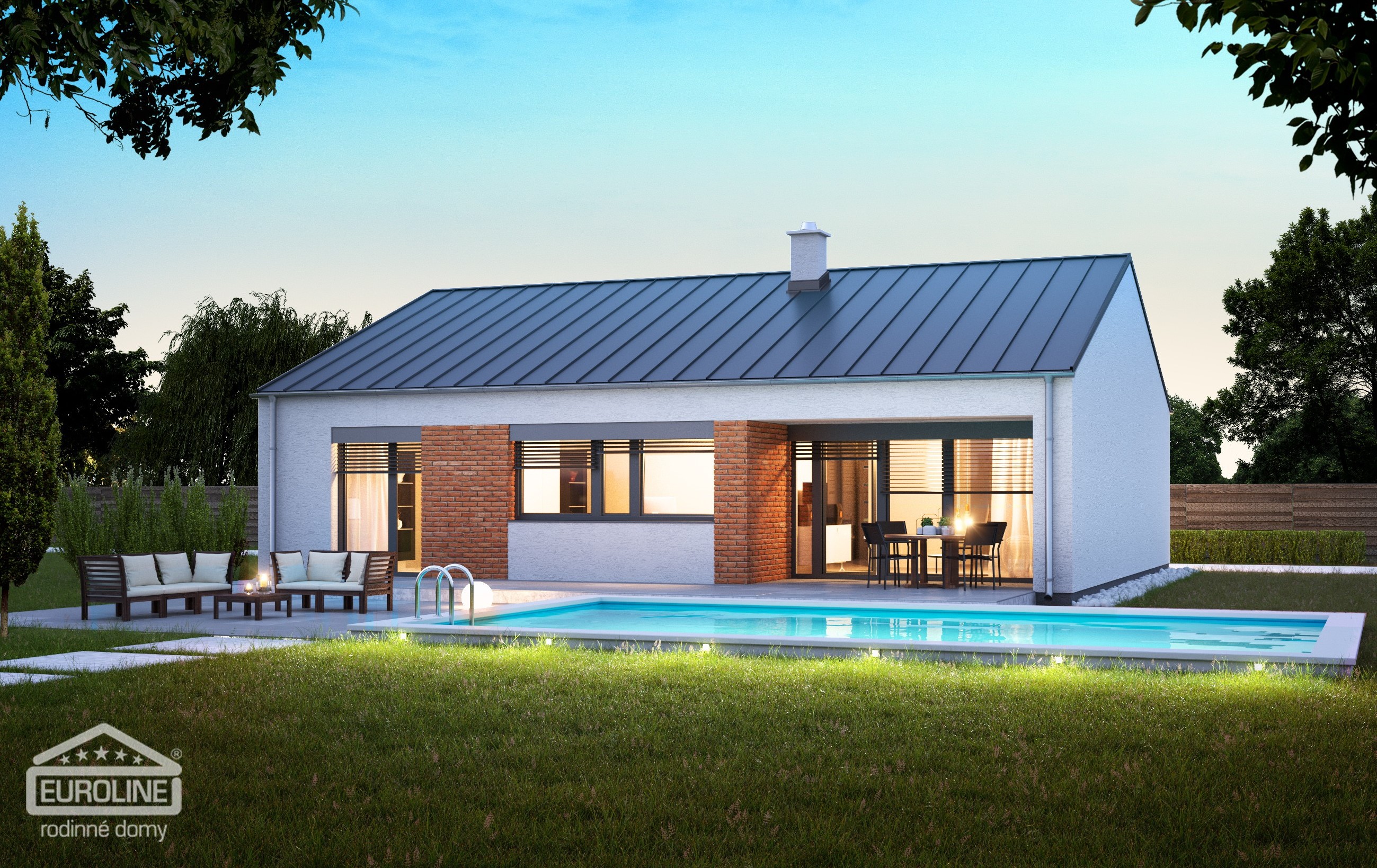 Cena včetně DPH. Orientační cena domu na klíč vypočtená na základě průměrných cen při optimalizovaném standardu použitých materiálů a technologií v poměru cena/výkon. Cena obsahuje základovou desku. Cena neobsahuje terasu, krbovou vložku, žaluzie, systém řízeného větrání s rekuperací, kuchyňskou linku ani žádný jiný nábytek, oplocení pozemku, zpevněné plochy na pozemku, sadové úpravy.