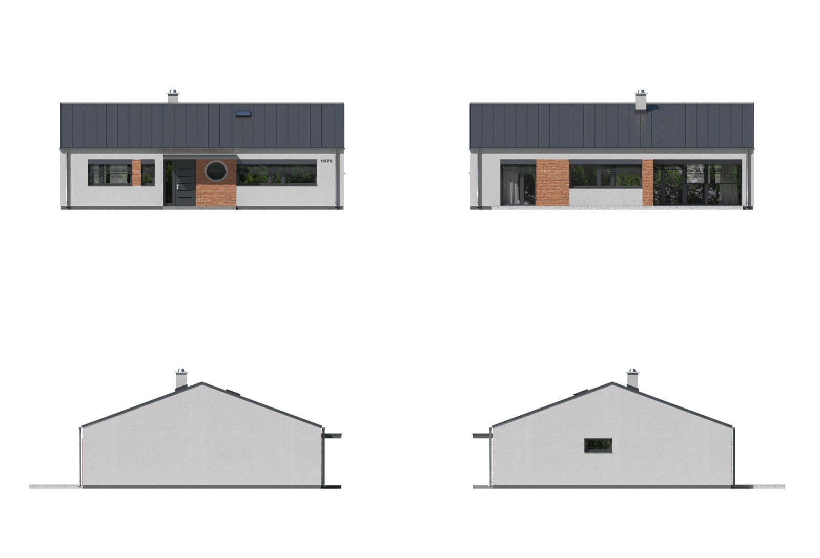 Moderní, menší rodinný dům typu bungalov s efektivně využitým vnitřním prostorem a minimem chodeb. Dům je ideální pro bydlení rodiny se 2 dětmi. Výhodou je ekonomicky úsporné řešení bez pevného stropu se sádrokartonovým podhledem. Architektonicky zajímavým a zároveň praktickým prvkem je překrytí vstupu a části terasy.