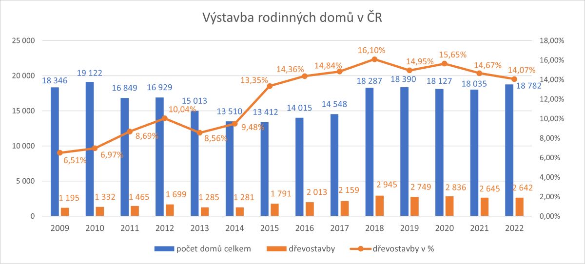 Celkový počet dokončených rodinných domů je v posledních 5 letech poměrně stabilní a každoročně překračuje hranici 18 000. Stejně tak počet zděných domů (z cihel či tvárnic) se příliš nemění a osciluje kolem počtu 15 000. Oproti tomu podíl dřevostaveb na celkové roční produkci rodinných domů v posledních 5 letech kolísá mezi 14 – 16 %, což odpovídá počtu 2 600 – 2 900 domů.
